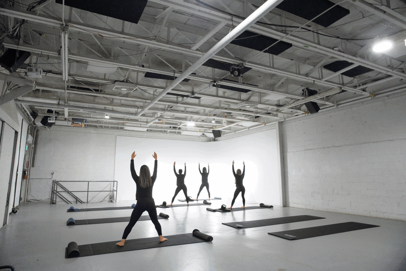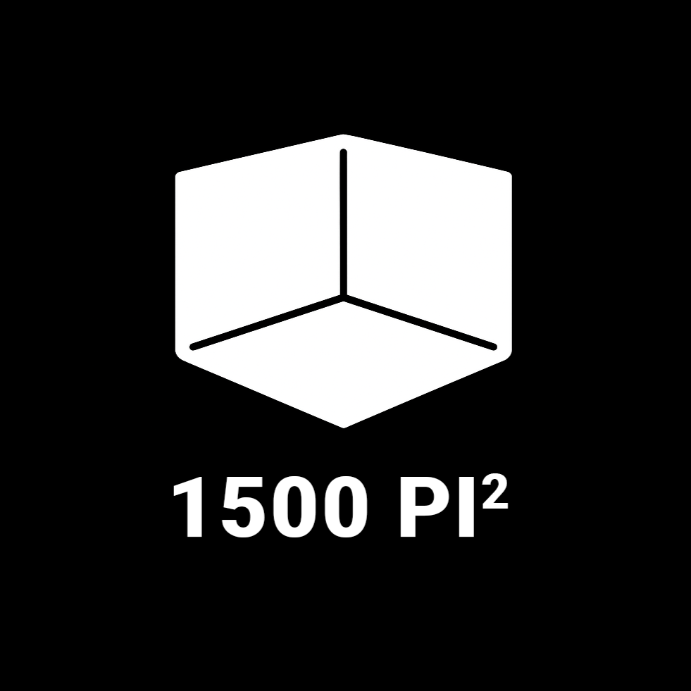 Studio 1500 pi² avec mur cyclo 400 pi². Hauteur libre de 12 pi jusqu’aux fermes (truss), avec 2 pi supplémentaires de dégagement.